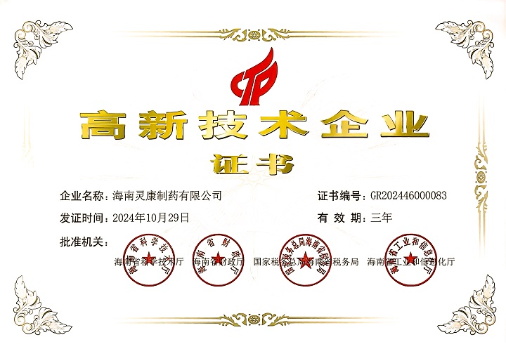 2024年國家高新技術(shù)企業(yè)認定由海南省科學(xué)技術(shù)廳、海南省財政廳、國家稅務(wù)總局海南稅務(wù)局、海南省工業(yè)和信息化廳綜合評定、聯(lián)合審評。評審認定工作重點圍繞3年來公司的科技立項、成果轉(zhuǎn)化、高新技術(shù)產(chǎn)品收入、知識產(chǎn)權(quán)情況、營業(yè)收入、研究開發(fā)費用以及研究開發(fā)人員等相關(guān)情況進行梳理評審,每次認定有效期為三年。截止目前,海南靈康制藥有限公司已連續(xù)5次通過該認定。